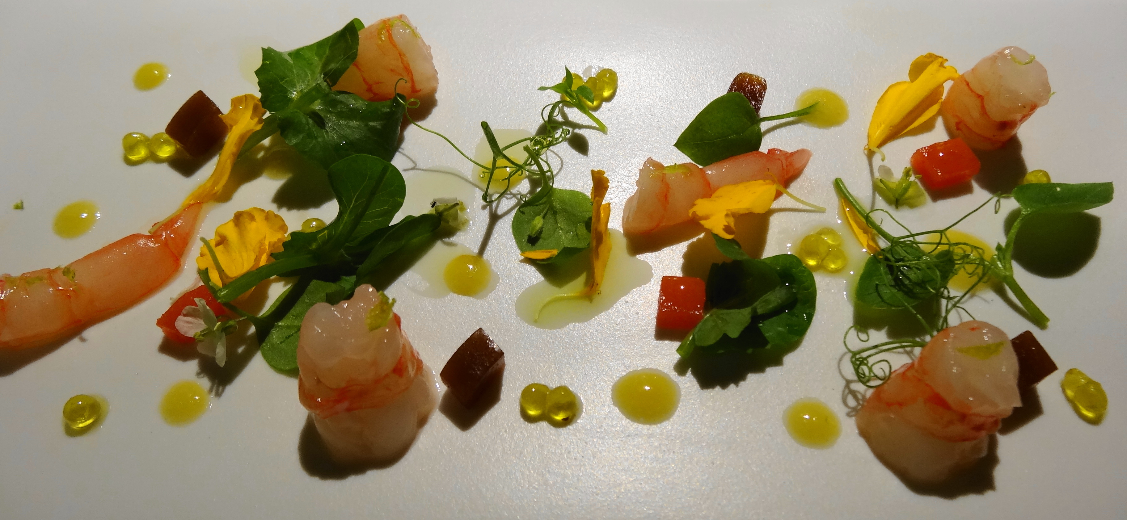 Menú degustado: épica galleta oreo rellena de parmesano, deliciosa crema de coliflor con caviar de la Vall d’Arán y caviar de aceite, colitas de gambas con membrillo y flores casado con una copa de Miquel Jané Sauvignon blanc. Pictórica ensalada llena de cromatismo con gambas desnudas de Palamós y dados de tomate formando el color rojo, hojas y ramas finas con sabor a guisante aportan el color verde y gotas de aceite de oliva virgen extra junto a hojas de flores amarillas son la pincelada de este color. Gnocchi de erizos para ponerse en pie y ovación cerrada con una copa de Finca Els Camps del 2010. Los mejores macarrones (de mi vida) a la trufa blanca, para llorar de emoción, servido en una no menos original sartén de cristal. ¡puro hedonismo! ¡macarrones de culto!. Sensual lubina combinada con butifarra negra, gelatina de tripa de bacalao y caldo de cabezas de gamba acompañado de una copa de La Comedia 2012. Para finalizar el apartado salado, un vibrante cochinillo con su costra crujiente para cortar con la mítica y estilizada navaja Laguiole en Aubrac todo un guiño a su origen francés, servido de una copa de Abel Mendoza Torrontés, un blanco con una acidez capaz de neutralizar la grasa del gorrino. Postre dulce de pà de pessic de avellanas con helado de chocolate emparejado con una copa de Lustau East India Solera. Los deseados petits fours: falso helado de chocolate relleno de aceite de oliva, crujiente de chocolate blanco y galleta de chocolate negro.